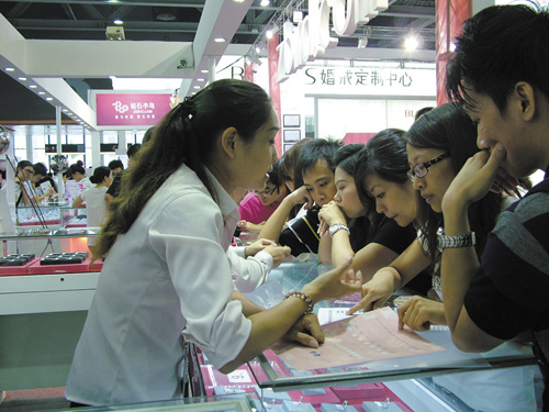 本报讯 (记者  周慧民)  2011夏季中国婚博会于7月16日至17日在广州琶洲保利世贸展馆举行。各参展企业纷纷推出各种优惠活动,虽然展会期间阴雨不断,但展馆内参观的人群却是摩肩接踵,尤其是婚戒柜台前一对对俊男靓女亲密无间地在挑选喜欢的钻戒,脸上洋溢着幸福甜蜜的笑容。       “钻石恒久远、一颗永流传”,目前钻石戒指已成为新人们结婚的首选。然而,今年钻戒价格却普遍上涨。据悉上半年,裸钻价格上涨25%以上,现在一粒0 .5克拉的裸钻,价格一般都在1万元以上。此次婚博会上,欧宝丽、钻石小鸟、卡芬连、帕蒂、BLOVES等都准备了众多款精美的钻戒、吊坠、耳钉等钻饰产品,以最优惠的价格回馈顾客。如钻石小鸟推出1000至4000元的钻石对戒,受到准新人的热捧;碧玉丰珠宝则不仅有专为婚博会推出“连系所爱——翡翠配对绳结展”,还展示了碧玉丰各个时期的翡翠精品及广受市场欢迎的翡翠首饰,别具一格的展品深得市民喜爱。   在展会上,中国婚博会组委特邀中华全国工商联珠宝业商会珠宝检测研究中心现场免费检测,为消费者保驾护航。       据了解,本届婚博会有2500个中外名品店参展。在两天的展期中,所有商家产品和服务价格都低于广州门店价,因此本届婚博会成为广州市民选购各种婚嫁产品的首选之地。   |